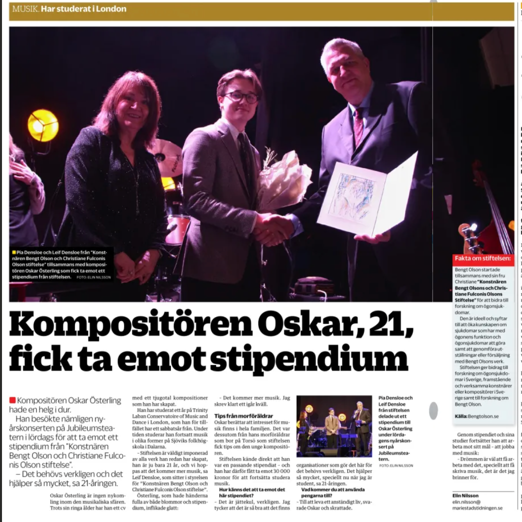 Oskar Österling, born in Stockholm in 2004, is a Swedish composer, pianist, and (sometimes) singer active in Sweden and England. His education began at Lilla Akademien, where he studied composition under Matthew Peterson and piano with Anders Hägerström and Sergei Reznikov. In 2023, he continued his studies at Trinity College of Music in London under Errollyn Wallen CBE, Master of the King’s Music.